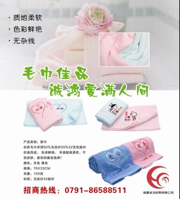 巾業(yè)求金 誠鴻愛滿天下 毛巾面向全省火熱招商中。。。。。 招商熱線:0791-86588511 86588522 網(wǎng) 站: www. 86588511.com 客服QQ:565721737 辦公地址:南昌市西湖區(qū)灌嬰路599號國際財訊中心815 特點(diǎn):1色彩鮮艷 2質(zhì)地柔軟 3 無雜線 產(chǎn)品類別:面巾 此款毛巾采用50%無捻紗50%32支色股紗織造而成,色澤鮮艷,手感超級柔軟,不傷皮膚,是您的最佳選擇! 顏色:灰色 黃色 規(guī)格:76X33CM 克重:100克 材質(zhì):無捻紗32股紗 可以印刷公司LOGO 毛巾品牌 誠鴻 企業(yè)簡介 南昌誠鴻貿(mào)易有限公司致力打造“品質(zhì)生活,品位人生”的生活消費(fèi)理念,使其具有獨(dú)特風(fēng)格與實用價值的家居生活百貨,享受和品位真正的時尚浪漫感覺,滲透現(xiàn)代都市白領(lǐng)人的創(chuàng)新,個性,時尚,品位的喜好和生活狀態(tài)的需求,打造一個全新的領(lǐng)導(dǎo)品牌。 南昌誠鴻貿(mào)易有限公司攜手國內(nèi)外知名個性的家居用品品牌廠商,達(dá)成緊密長期的戰(zhàn)略合作關(guān)系,同時自主開發(fā)和設(shè)計各類個性用品,公司匯聚品位裝飾、廚房用品、居家日用、飾品禮品、新奇小家電、布藝花藝、化妝用品、玩具卡通、文體用品、汽車周邊十大系列產(chǎn)品,各類時尚個性產(chǎn)品應(yīng)有盡有。 公司位于江西省會城市南昌商務(wù)中心區(qū),在理念和營銷模式上具有非常獨(dú)厚的優(yōu)勢,在21世紀(jì)的今天,正值家居用品的個性化,多元化,情侶用品的商機(jī)來臨之際,必將引爆新一輪的時尚個性風(fēng)暴和財富狂瀾。