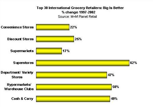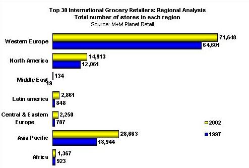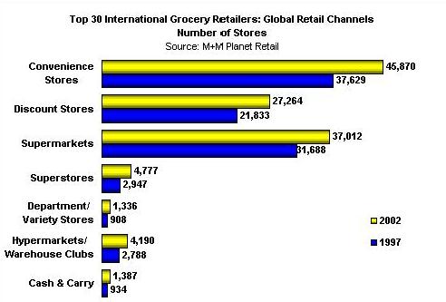 (聯(lián)商網(wǎng)編譯)在過(guò)去10年中,“M+M星球零售業(yè)研究機(jī)構(gòu)”一直跟蹤調(diào)查世界上最大的食品零售商家在全球的發(fā)展。利用我們公司詳盡而全面的零售商檔案數(shù)據(jù)庫(kù),我們分析了國(guó)際上30個(gè)知名食品商在世界各地所開(kāi)的商店類(lèi)型(注:根據(jù)零售業(yè)態(tài)分類(lèi)),并對(duì)全球零售市場(chǎng)的結(jié)構(gòu)和零售商的發(fā)展策略有了一個(gè)清晰的描繪。為了這次研究,我們排除了那些非食品類(lèi)的專(zhuān)賣(mài)店如電器商店,服飾店,DIY商店和陳設(shè)品店。 統(tǒng)觀(guān)全球 在過(guò)去五年中,國(guó)際零售30強(qiáng)所開(kāi)的食品類(lèi)相關(guān)的商店總數(shù)增加了23%。到2002年,商店總數(shù)由1997年的98,723間上升到122,000間。大型零售店模式是主要增長(zhǎng)源,該類(lèi)型包括大型超級(jí)市場(chǎng)、超大型自助百貨商場(chǎng)/倉(cāng)儲(chǔ)會(huì)員店,現(xiàn)金支付運(yùn)輸自理式和百貨商店等。這種向大規(guī)模、大營(yíng)業(yè)面積發(fā)展的趨勢(shì)又以ITM、奧桑(Auchan),阿霍德(Ahold) 和瑞威(Rewe)最為顯著。 然而,我們也不應(yīng)該忽略小型零售店模式的作用。一般的自選商場(chǎng)、折扣商店和便利店仍是零售商成功打入某個(gè)市場(chǎng)或者填補(bǔ)成熟市場(chǎng)空隙的戰(zhàn)略載體。