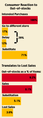 顧客對(duì)缺貨的低容忍度 本項(xiàng)研究的調(diào)查結(jié)果顯示:當(dāng)碰到想買的商品缺貨時(shí),顧客在71%的情況下會(huì)購(gòu)買替代商品;但還有29%的情況下他們不會(huì)購(gòu)買任何代替品。顧客是否愿意購(gòu)買替代品取決于商品的具體種類,并與顧客的品牌忠誠(chéng)度以及替代品是否合乎需要有關(guān)。然而,顧客們也表示,他們不會(huì)無(wú)限度的容忍缺貨狀況的發(fā)生。 最多三次缺貨 平均來(lái)看,如果顧客光顧某家店鋪2到4次都買不到自己想要的物品后,他就不會(huì)再來(lái)這家店鋪消費(fèi)。但大部分經(jīng)常光顧某家便利店的顧客在受到2至3次打擊后,就會(huì)轉(zhuǎn)到別家店鋪。由于這些??蛶缀趺刻於家奖憷曩I東西,零售商必須在一到兩天內(nèi)補(bǔ)足缺貨,以避免丟掉一個(gè)忠實(shí)的顧客。 9.2%的商品種類缺貨 在參與研究的便利店中,一個(gè)最普通的營(yíng)業(yè)日,有9.2%被審計(jì)的商品種類會(huì)缺貨。從更長(zhǎng)營(yíng)業(yè)日期來(lái)看,這個(gè)問題更為廣泛,各線商品每周有超過20%至少有一天缺貨。的確,缺貨是便利店經(jīng)營(yíng)者一個(gè)嚴(yán)重的問題,但零售商可以采取多種方式降低缺貨,有些方法很簡(jiǎn)單,有些則更加復(fù)雜些。 缺貨平均每年帶來(lái)3%的銷售額流失 就參與本項(xiàng)研究的各便利店而言,由于碰到缺貨而顧客又不愿意購(gòu)買替代商品所導(dǎo)致的銷售額流失為每年平均3%。這個(gè)結(jié)果是根據(jù)被調(diào)查商品種類缺貨程度和它們的單價(jià)計(jì)算出來(lái)的。