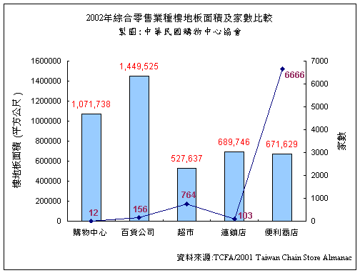 第二年的購(gòu)物中心及相關(guān)零售產(chǎn)業(yè)發(fā)展情況,本報(bào)告依據(jù)本協(xié)會(huì)2001年年鑒及連鎖店協(xié)會(huì)年鑒的資料收集,就綜合零售業(yè)(購(gòu)物中心, 百貨公司, 量販店, 超級(jí)市場(chǎng), 及連鎖便利店)的家數(shù)及樓地板面積,如圖一所示: