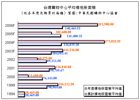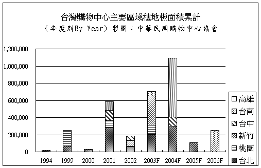 臺(tái)灣第一家購(gòu)物中心可追溯自1994年,經(jīng)過(guò)五年的開(kāi)發(fā)后才陸續(xù)有第二家購(gòu)物中心加入營(yíng)運(yùn)。而1999年起至可謂購(gòu)物中心個(gè)案的蘊(yùn)育期,自此每年皆有購(gòu)物中心加入營(yíng)運(yùn)市場(chǎng);圖三為歷年數(shù)據(jù)統(tǒng)計(jì)圖,可看出購(gòu)物中心個(gè)案開(kāi)發(fā)第一波成長(zhǎng)期是在2000年至2002年間, ’產(chǎn)業(yè)’ 的雛形由此成型。在此期間內(nèi)開(kāi)店數(shù)自4家成長(zhǎng)至12家,而累計(jì)樓地板面積亦由304,572平方公尺增加至1,071,738平方公尺。2001年原預(yù)計(jì)開(kāi)幕七家,其中臺(tái)中老虎城及臺(tái)北ZOO MALL延后至2002年開(kāi)幕,所以2001年應(yīng)僅新增五家,2002年截至八月份累計(jì)三家購(gòu)物中心個(gè)案。由圖四可以得知同時(shí)根據(jù)現(xiàn)有資料顯示,可預(yù)測(cè)未來(lái)三年內(nèi),購(gòu)物中心店數(shù)成長(zhǎng)速度趨于緩和,但樓地板面積仍以大幅度攀升。