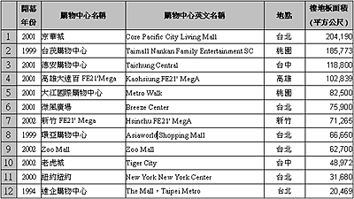 表一將現(xiàn)有開(kāi)幕12家購(gòu)物中心的面積做一排序,依本協(xié)會(huì)年鑒所載面積大小依序?yàn)榫┤A城,臺(tái)茂,德安,高雄大遠(yuǎn)百,大江,微風(fēng)廣場(chǎng),新竹大遠(yuǎn)百,環(huán)亞,Zoo Mall,老虎城,紐約紐約及遠(yuǎn)企等各購(gòu)物中心,詳細(xì)量體數(shù)據(jù)如下表一所示。