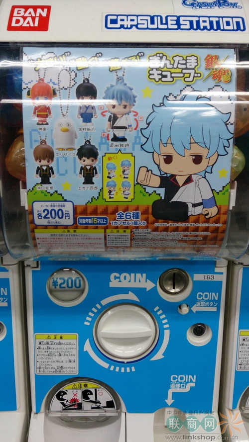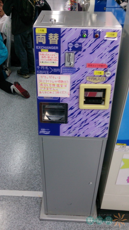 最后吐槽一下,扭蛋機區(qū)旁邊有3臺硬幣兌換機,藍色的如圖,我將5000日元換成5張1000的,紫色的則是將1000的紙幣換成10個100的硬幣,無底洞啊親,一會兒時間,錢就花完了,手上一袋子的塑料玩意兒。