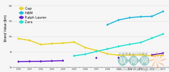 在看2013年,Gap在四大國際服飾品牌的品牌價(jià)值排名中以39.2億美元位列第四,排名第三的Ralph Lauren品牌價(jià)值45.84億美元,第二的Zara108.21億美元,而位居榜首的H&M品牌價(jià)值搞達(dá)181.68億美元。