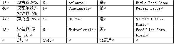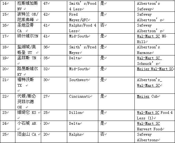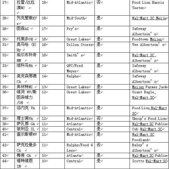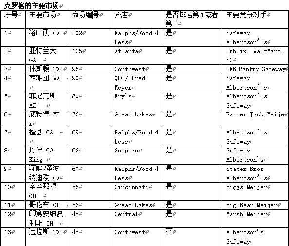 在2002年末,克羅格的經營范圍可以分成48個主要市場(主要市場是指該區(qū)域有9成以上的克羅格旗下的商店),其中的41個主要市場克羅格的地位可以排到第一或者第二。我們前五位的主要市場是洛杉磯、亞特蘭大、休斯頓、西雅圖和菲尼克斯。