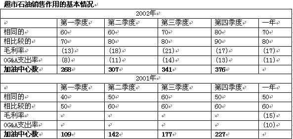 在2002年末,克羅格在28個州經營了376家加油站超市。公司計劃在2003財政年度末擁有大約480家此類的超市??肆_格預計2003年在他的加油站超市和便利店銷售的石油總加侖數(shù)將會達到17億加侖,這個數(shù)額占了全美石油總銷售量的大約1.25%。