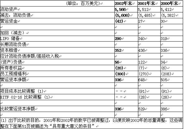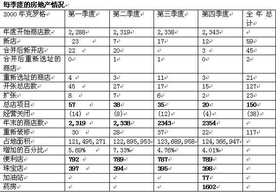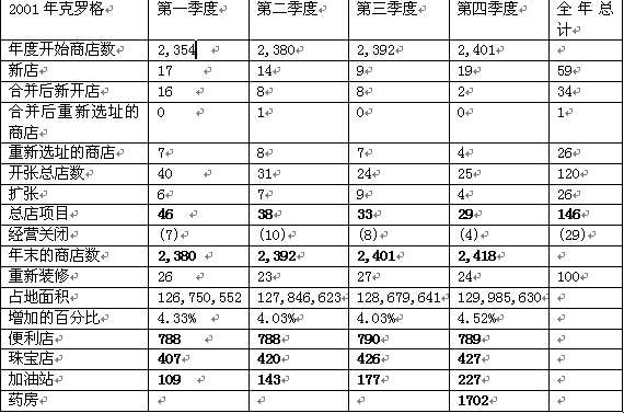 前言   本報(bào)告列舉了關(guān)于克羅格公司未來發(fā)展演變的一些頗有遠(yuǎn)見的論述。這些論述以管理假設(shè)論和信心論為基礎(chǔ),并立足于目前所能搜集到的信息,論點(diǎn)之間彼此聯(lián)系,同中有異,都提到了如下問題:預(yù)計(jì)的每股收益簡(jiǎn)稱“EPS”)的長(zhǎng)勢(shì),營(yíng)利資本的減少,我們創(chuàng)造現(xiàn)金流的能力,我們的戰(zhàn)略性成長(zhǎng)計(jì)劃(簡(jiǎn)稱“計(jì)劃”),并用了如“舒適的”,“忠實(shí)的”,“期待”,“目的”,“目標(biāo)”等相關(guān)詞匯或詞組來加以說明。這些論述雖可謂高瞻遠(yuǎn)矚,但受不確定因素和其他因素的影響,故而可能與今后的實(shí)際情況大相徑庭。   本報(bào)告中其他涉及我們的期望,預(yù)測(cè),信仰,意圖或決策的論述與1934年出臺(tái)的有價(jià)證券交易條例21章E部分的涵義一致,可謂是長(zhǎng)足之見。但是我們盡管相信這些論述是準(zhǔn)確的,總體經(jīng)濟(jì)的不確定性,我們的勞動(dòng)力關(guān)系,我們將計(jì)劃及時(shí)付諸實(shí)施的能力以及下面將提到的其他各種不確定因素都可能使得以后的實(shí)際情況與我們的論述背道而馳。   2001年11月,我公司制訂了計(jì)劃,支持對(duì)核心行業(yè)的額外投資,以增加銷售額,提高市場(chǎng)份額。該計(jì)劃有三個(gè)要領(lǐng):減少操作費(fèi)用,一般支出和行政管理費(fèi)用(以下簡(jiǎn)稱OG&A),相應(yīng)地增加廣告推銷和采購活動(dòng)的支出,并以降低零售價(jià)格為指標(biāo)。2003年2月1日,我們已經(jīng)降低了3.06億美元的成本。2002年,我們按照計(jì)劃的指標(biāo),精減了將近1500個(gè)管理人員和書記員,同時(shí)把納什維爾的地方辦事處和配給中心跟亞特蘭大和中南部地區(qū)的作了合并。我們期待著,在2003財(cái)政年底,可以突破原定的降低成本5億美元的目標(biāo)。   2002年,我們的同類食品商店銷售額情況,包括超級(jí)市場(chǎng)燃料中心,比起2001年來沒有發(fā)生變化。我們認(rèn)為2002年疲軟的經(jīng)濟(jì)態(tài)勢(shì)和日益增長(zhǎng)的競(jìng)爭(zhēng)一定程度上抵銷了本公司按既定計(jì)劃降價(jià)所帶來的影響。   2003年2月1日,該計(jì)劃花費(fèi)的整改費(fèi)用總額達(dá)到近5200萬美元,主要用于支付裁員所需的安置費(fèi),整合配給中心和公司轉(zhuǎn)型。我們相信繼續(xù)推行這一計(jì)劃將提高我們的競(jìng)爭(zhēng)地位。同時(shí),我們已經(jīng)發(fā)掘了降低成本和更有效營(yíng)運(yùn)的額外時(shí)機(jī)。例如,2003年3月,我們宣布將總部分別設(shè)在密歇根州利沃尼亞市和俄亥俄州哥倫布市的兩個(gè)零售部門合并。   2003年,我們估計(jì)每股收益將達(dá)到1.63美元。這個(gè)預(yù)測(cè)包括了每股約0.02美元的用于系統(tǒng)改進(jìn)的耗費(fèi),以及密歇根州和哥倫布市各部門合并時(shí)的費(fèi)用,還包括養(yǎng)老退休金和衛(wèi)生保健方面支出的增長(zhǎng)部分。由于目前還不能估計(jì)過剩能量購股帶來的點(diǎn)對(duì)市場(chǎng)的影響將如何,故2003年每股收益暫不考慮該影響。我們期待同類食品商店的銷售態(tài)勢(shì),包括燃料,在2003年將會(huì)是積極的。這些預(yù)測(cè)首先假設(shè)通貨膨脹率維持不變,經(jīng)濟(jì)水平和競(jìng)爭(zhēng)的環(huán)境也保持不變。目前,我們并沒有逾越2003這一財(cái)政年的實(shí)際情況而指導(dǎo)銷售或收入。   基于目前的利率環(huán)境,我們預(yù)測(cè)2003年的利息支出將達(dá)到近5.75億到5.95億美元,此外,在2003年,折舊費(fèi)用將達(dá)到近11.75億到12億美元,OG&A 費(fèi)用率將增加約40到50個(gè)基本點(diǎn),我們的毛利潤(rùn)率,除去LIFO的影響,將增加近20到30個(gè)基點(diǎn)。2003年LIFO費(fèi)用預(yù)計(jì)將近3500萬美元。 1999年第3季度,我們制定了目標(biāo),即在2004年第3季度末前降低5億美元營(yíng)運(yùn)資本凈額。在此,營(yíng)運(yùn)資本凈額是指LIFO信貸下的流動(dòng)營(yíng)業(yè)資產(chǎn),減去流動(dòng)營(yíng)業(yè)負(fù)債所得的金額。因此,我們歷史地再現(xiàn)了近年來上述定義下的營(yíng)運(yùn)資本凈額。2003年1月22日,SEC簽發(fā)了33-8176號(hào)讓渡公文,提出了關(guān)于揭露非GAAP金融措施的新要求。讓渡公文允許某些非GAAP的金融措施上臺(tái),只要這些措施服從于直接可比的GAAP金融措施,而不發(fā)生抵觸。我們視公布營(yíng)運(yùn)資本額為評(píng)估我們營(yíng)運(yùn)資金操作情況的一個(gè)重要手段,是突破1999年制定的舊的目標(biāo),獲得管理措施上的進(jìn)步的基礎(chǔ),因而我們將繼續(xù)公布營(yíng)運(yùn)資本凈額。然而,為與33-8176號(hào)讓渡公文相一致,今后所有營(yíng)運(yùn)資本凈額的公布都將采用人們更普遍認(rèn)可的定義,即營(yíng)運(yùn)資金等于流動(dòng)資產(chǎn)減去流動(dòng)負(fù)債。我們并不希望只在公布營(yíng)運(yùn)資本凈額和執(zhí)行其他任何被普遍接受的會(huì)計(jì)原則措施之間二選一。    2002年底,營(yíng)運(yùn)資本比2001年底減少了6900萬美元,比2000年底減少了7200萬美元, 比較營(yíng)運(yùn)資本凈額比2001年底減少了1.93億美元,比2000年底減少了5000萬美元。我們期待在2003年中將營(yíng)運(yùn)資本凈額再降低1億。下表顯示了2000年末、2001年