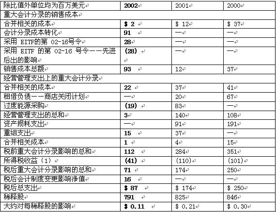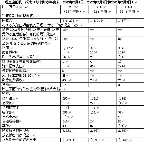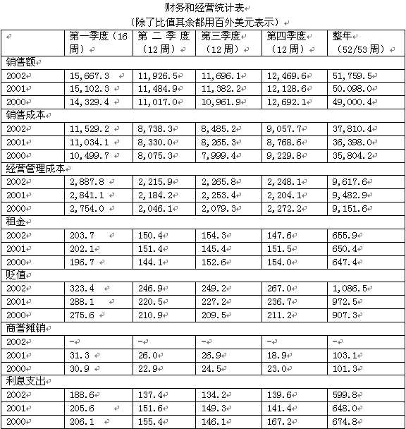 到期債務(wù)   克羅格財(cái)務(wù)戰(zhàn)略計(jì)劃的主要目標(biāo)是贏得達(dá)到BBB/Baa2的存款等級(jí)。我們相信BBB/Baa2的存款等級(jí)會(huì)給公司的長期債務(wù)、商業(yè)票據(jù)市場帶來最大的機(jī)動(dòng)性,而且會(huì)降低資產(chǎn)的成本??肆_格近期的負(fù)債率如下所示: Fitch BBB Moody’s Baa3 積極前景 S&P BBB- 積極前景   財(cái)務(wù)目標(biāo):   1.達(dá)到財(cái)務(wù)目標(biāo)與BBB/Baa2的存款等級(jí)看齊。   2.降低凈營運(yùn)資本。2004年第三個(gè)季度的凈營運(yùn)資本與1999年同期的比能降低50000萬美元。   3. 平衡到期債務(wù).   4. 維持強(qiáng)勢的資金計(jì)劃。   5.用大約三分之一的現(xiàn)金流償還債務(wù),然后用剩下的三分之二重新購買股票或者分配紅利。在2003年上半年,克羅格完成了以下的財(cái)務(wù)事務(wù): 在1月發(fā)行了50000萬美元5.5%利息的債券,到2013年2月1日到期。隨后: 在2月28日,因?yàn)樽赓U期滿,購買了20200萬美元的所有權(quán),有效期16年。 在3月1日,到期兌換了Fred Meyer 7.15%利息的25000萬美元的債券。 選擇性的提前償還了2007年到期的Quality Food Centers公司8.7%利息的從屬債券310萬美元 在2003年5月21日,完成了364天周期的同業(yè)信用透支高達(dá)10億美元的償還和重新透支。由于公司良好的現(xiàn)金流動(dòng)克羅格公司的透支額下降了25000萬美元??肆_格有主要的三大同業(yè)信用透支: 2004年5月19日到期的10億美元的364天周期的信用透支。 如果克羅格不延期或者不提前償還的話,有價(jià)值81250萬美元的5年期信用協(xié)議將在2006年5月23日到期。 如果克羅格不延期或者不提前償還的話,有價(jià)值70000萬美元的5年期信用協(xié)議將在2007年5月22日到期。   股票回購   在2000年3月31日,董事會(huì)決定授權(quán)回購多達(dá)7億5000萬美元的克羅格普通股。這個(gè)股票計(jì)劃替代了2000年1月制定的10億美元的授權(quán)購買計(jì)劃。在2000年財(cái)政年度,我們在董事會(huì)新的授權(quán)下在公開市場購買了53900萬美元的股票。而其他的大約4300萬美元的股票是遵循另一個(gè)獨(dú)立的重新購買計(jì)劃實(shí)施的。這個(gè)獨(dú)立的計(jì)劃是使用了與“股票買賣特權(quán)重新采購計(jì)劃”(“Stock Option Repurchase Program”)相關(guān)的股票買賣特權(quán)和加上的稅收收益。   在2001年3月1日,董事會(huì)又決定授權(quán)重新購買新增加的10億美元的克羅格普通股。這個(gè)重購計(jì)劃與2000年授權(quán)的7億5000萬美元的計(jì)劃是完全不同的。在2001財(cái)政年度,為了完成7億5000萬美元的重購計(jì)劃,我們在公開市場購買了2億900萬美元的股票。此外還有在股票買賣特權(quán)重新采購計(jì)劃下購買的1億8000萬美元股票。與此同時(shí),我們響應(yīng)10億美元的計(jì)劃,在公開市場購買了3億4300萬美元的股票。   在2002財(cái)政年度,我們?yōu)榱送瓿?0億美元的計(jì)劃我們又在公開市場購買了大約6億5700萬美元的股票。   除了上述的計(jì)劃外,董事會(huì)又新授權(quán)了一個(gè)股票回購計(jì)劃總計(jì)達(dá)50億美元,這個(gè)計(jì)劃將在2002年12月10日有效。在這個(gè)計(jì)劃下,我們在2002年已經(jīng)在公開市場購買了6億300萬美元的股票。2002財(cái)政年度我們還在股票買賣特權(quán)回購計(jì)劃下購買了大約7100萬美元的股票。董事會(huì)是依據(jù)重新購買的股票的期望收益能否超過我們公司的資產(chǎn)成本來考慮授權(quán)購買股票。   凈營運(yùn)資本   減少凈營運(yùn)資本是公司主要的財(cái)政目標(biāo)之一。在1999年的第三季度,我們建立了到2004年末,使總的凈營運(yùn)資本減少50億美元的目標(biāo)。在這個(gè)目標(biāo)中,凈營運(yùn)資本被定義為在后進(jìn)先出貸方款項(xiàng)后的當(dāng)前經(jīng)營資本減去當(dāng)前的經(jīng)營債務(wù)。因此,我們公司歷來的凈營運(yùn)資本的計(jì)算都以這個(gè)定義為標(biāo)準(zhǔn)。   在2003年1月22日,政權(quán)交易委員會(huì)發(fā)布了第33-8176號(hào)令。法令對(duì)一些非會(huì)計(jì)準(zhǔn)則的財(cái)政方法進(jìn)行了定義并且建立了新的要求。如果一些非會(huì)計(jì)準(zhǔn)則的財(cái)政方法與會(huì)計(jì)準(zhǔn)則的方法沒有沖突,法令允許使用此類的非會(huì)計(jì)準(zhǔn)則。我們會(huì)繼續(xù)使用凈營運(yùn)資本這項(xiàng)指標(biāo)。因?yàn)槲覀兿嘈潘鼘?duì)我們的財(cái)政經(jīng)營表現(xiàn)是一個(gè)有效的衡量手段,同時(shí)也是我們高級(jí)管理層了解1999年制定的目標(biāo)的完成進(jìn)度的一個(gè)參考。盡管如此,為了與第33-8176號(hào)令一致,公司所有未來的凈營運(yùn)資本的指標(biāo)的定義將會(huì)遵循法令中的更寬廣的定義(當(dāng)前資產(chǎn)減去當(dāng)前負(fù)債)。我們公司也絕對(duì)沒有要用公司定義的凈營運(yùn)資本代替任何一個(gè)普遍接受的會(huì)計(jì)條款的意圖。   在2002年末,營運(yùn)資本與2001年末相比減少了6900萬美元,與2000年末相比減少了7200萬美元。在2002年末,相比較的凈營運(yùn)資本與2001年末相比減少了19300萬美元,與2000年末相比減少了5000萬美元。我們希望在2003年,公司的凈營運(yùn)資本會(huì)減少10000萬沒有。相應(yīng)的2002年、2001年和