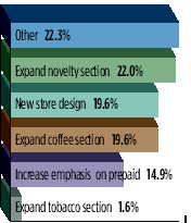 在“店內(nèi)重心”方面,調(diào)查結(jié)果顯示2004年商家將重點(diǎn)經(jīng)營(yíng)的產(chǎn)品領(lǐng)域廣泛而且多樣,“其它”選項(xiàng)是大多數(shù)商家的選擇,甚至于對(duì)“什么是其它”的回答也更多樣,且不雷同。在受訪者提供的“其它”中,包括金融服務(wù)、沒(méi)什么新鮮的、確定特定目標(biāo)產(chǎn)品;提高效率;忠誠(chéng)方案;快速加油;關(guān)注顧客服務(wù);郵局;汽車(chē)修理服務(wù)等多種內(nèi)容。最顯著的一點(diǎn)是,只有幾個(gè)受訪者表示將把擴(kuò)展煙草版塊作為2004年的重心。