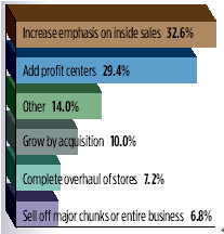 圖中內(nèi)容從上至下依次為:更加關(guān)注店內(nèi)營(yíng)業(yè)額 32.6%;增加利潤(rùn)中心 29.4%;其它 14.0%;通過(guò)合并增長(zhǎng) 10.0%;對(duì)門(mén)店全面徹底調(diào)整 7.2%;出售主要或全部資產(chǎn) 6.8%。