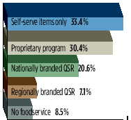 圖中內(nèi)容從上至下依次為:只經(jīng)營(yíng)自助食品 33.4%;自有商品方案 30.4%;全國(guó)品牌快餐店 20.6%;地區(qū)性品牌快餐店 7.1%;不提供食品服務(wù) 8.5%。