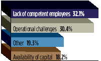 圖中內(nèi)容從上至下依次為:缺乏能干的雇員 32.1%;經(jīng)營(yíng)運(yùn)作挑戰(zhàn) 30.4%;其它 19.3%;資金短缺 18.2%。
