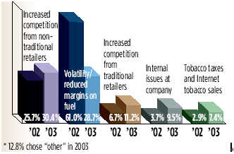 圖中內(nèi)容從左至右依次為:來(lái)自非傳統(tǒng)零售商的競(jìng)爭(zhēng)加?。黄屠麧?rùn)下降和易揮發(fā);來(lái)自傳統(tǒng)零售商的競(jìng)爭(zhēng)加?。还緝?nèi)部問(wèn)題;煙草稅和網(wǎng)上煙草銷(xiāo)售。2003年有12.8%的受訪者在回答“面臨的最大挑戰(zhàn)”時(shí)選擇了“其它”。
