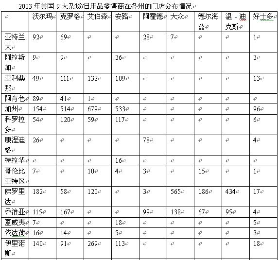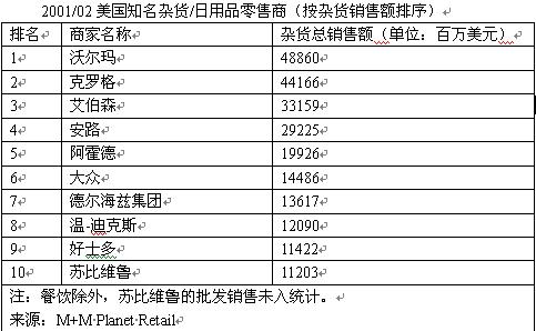 下表按照年凈營(yíng)業(yè)額大小次序列出了美國(guó)知名雜貨/日用品零售商。從中明顯可以看出,沃爾瑪?shù)男酆駥?shí)力遠(yuǎn)高于其他商家,其年?duì)I業(yè)額幾乎是離它最近的競(jìng)爭(zhēng)者克羅格的四倍。盡管塔吉特繼續(xù)保持高速度增長(zhǎng),但要接近沃爾瑪還有一段相當(dāng)長(zhǎng)的里程,而過去幾年艾伯森快速擴(kuò)大——這主要是1999年與American Stores合并的結(jié)果。位列第五的是凱馬特,該公司的同店銷售額和門店數(shù)量都在減少,目前正面臨著激烈的競(jìng)爭(zhēng)和財(cái)務(wù)困難。