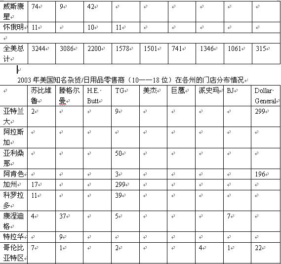 和許多國(guó)家的雜貨市場(chǎng)不同,美國(guó)食品零售業(yè)地區(qū)化程度很高,一些知名商家的全部銷售業(yè)績(jī)依賴的還不到五個(gè)州。例如,10大商家之一的大眾(Publix)有94%的門店分布在佛羅里達(dá)和喬治亞州,而排名第11的H.E. Butt在德克薩斯州以外地區(qū)只有一間門店。雖然如此,還是有幾個(gè)真正意義上的全國(guó)商家,其門店幾乎遍布各州。下表是18家最大的雜貨零售商的門店地理分布,里面列出了它們?cè)诿總€(gè)州的門店數(shù)量。表一是九大商家的門店分布,表二則是第10到18名的商家的門店分布情況。