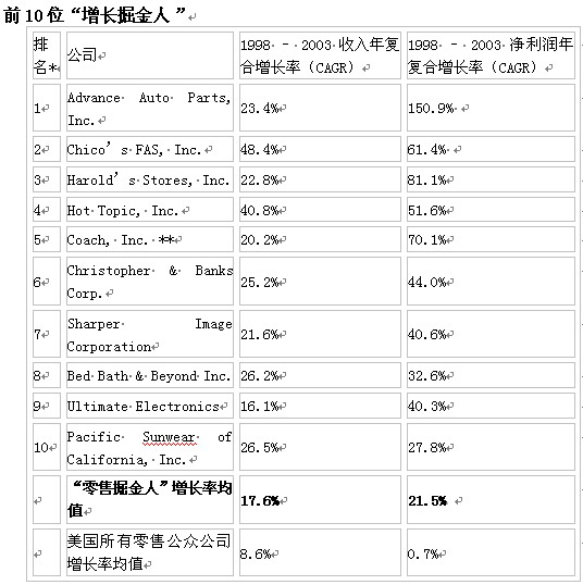 《零售展望》列舉的“增長掘金人”從200家美國的公眾上市零售公司中精選出51家。1998年至2003年間,這些璀璨的明星公司的收入增長率(17.6%)是所有公眾公司增長率(8.6%)平均值的兩倍。而且,這五年間,零售商整體的凈利潤增長非常小,還不到1%。而“增長掘金人”的平均年利潤增長率卻高達21.5%。