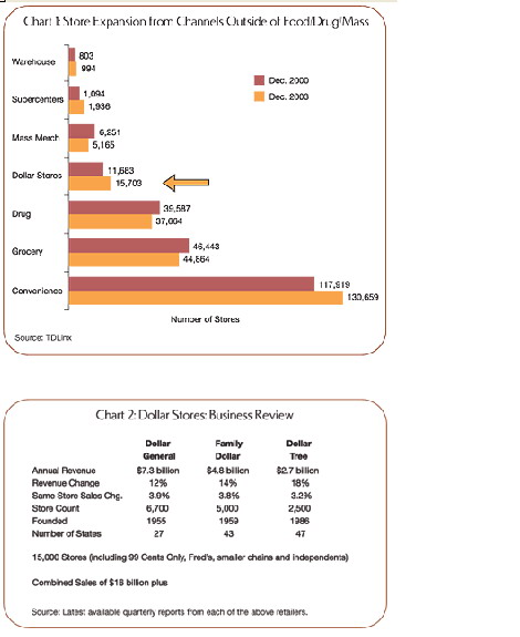 這一渠道三個(gè)最大的零售商為Dollar General、Family Dollar和Dollar Tree。它們的增長主要來自店鋪擴(kuò)張,Dollar General的年銷售額最高,為73億美元,Dollar Tree最低,為27億美元。雖然與美國食品雜貨、超大型市場(chǎng)及藥店的各主要零售商的年銷售額水平相比,這一數(shù)字也許顯得不大,但是,也是很有意義的。