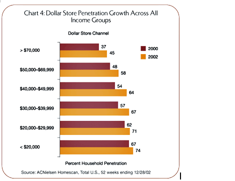 商品營銷活動(dòng)和壓縮定價(jià)的后果是,在高收入階層和低收入階層都產(chǎn)生了更多注重成本的消費(fèi)者。因此,許多傳統(tǒng)零售商開始引入一元店部門或一元店商品營銷活動(dòng),以從這一渠道的銷售額中分到一杯羹。例如,沃爾瑪?shù)募s20家門店中,有一元商品部門,并正在考慮推出他們自己的獨(dú)立式一元店??肆_格在2003年7月宣布,他們正在幾個(gè)市場(chǎng)試驗(yàn)他們自己的一元店通道。其它低價(jià)零售業(yè)態(tài),如Supervalu的Sav-A-Lot或Aldi’s,都對(duì)一元店零售渠道造成威脅。塔吉特也宣布計(jì)劃在125家商店試驗(yàn)一元部門。還有若干食品雜貨、超大型市場(chǎng)和藥品零售渠道的零售商,都在進(jìn)行一元貨品促銷,以利用這一零售趨勢(shì)。