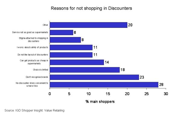 IGD調(diào)研顯示,不去折扣商店購(gòu)物的主要原因并不是購(gòu)物者對(duì)折扣商店有什么反感,而是去那里購(gòu)物不是很方便(28%)。