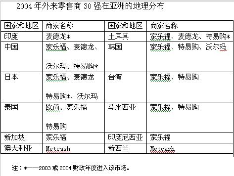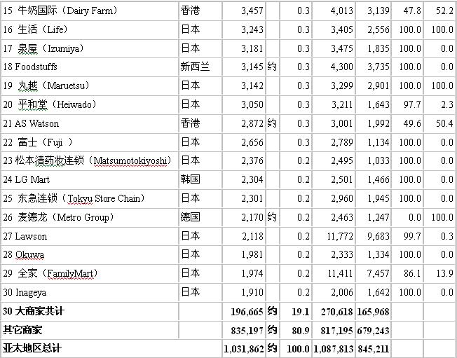 注: * 沃爾瑪持有日本西友公司37.8%的股份,但卻未將西友公司合并入賬。b – 10個(gè)月交易期。c – 凈營(yíng)業(yè)額中合并統(tǒng)計(jì)了樂天百貨公司(樂天百貨店、Lotte Mart、Lotte Super、LotteShopping.com、樂天影院)、Korea Seven和Lotteria Co Ltd.的業(yè)績(jī)。來(lái)源: M+M Planet Retail - www.planetretail.net 2003年亞太地區(qū)知名零售商(按市場(chǎng)份額排序)