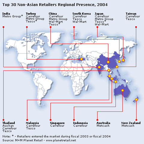 受到亞太地區(qū)巨大增長(zhǎng)潛力的吸引,同時(shí)也由于本土市場(chǎng)發(fā)展機(jī)會(huì)越來(lái)越少,非亞洲雜貨零售商逐漸擴(kuò)大其在亞太地區(qū)的營(yíng)業(yè)網(wǎng)絡(luò)。另外,許多國(guó)家放開了對(duì)外商投資的政策限制,更助長(zhǎng)了這股潮流。雖然亞太許多市場(chǎng)的競(jìng)爭(zhēng)也在加劇,但顯然,非亞洲雜貨商的營(yíng)業(yè)網(wǎng)點(diǎn)只會(huì)越來(lái)越多。