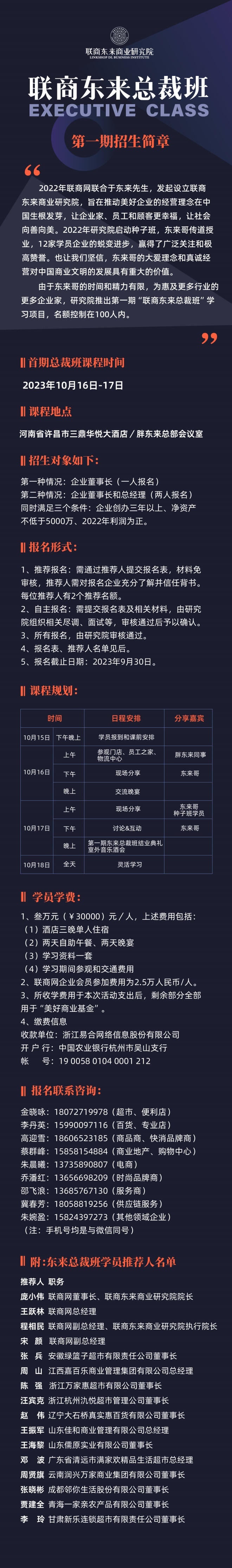 由于東來(lái)哥的時(shí)間和精力有限,為惠及更多行業(yè)的更多企業(yè)家,研究院推出第一期“聯(lián)商?hào)|來(lái)總裁班”學(xué)習(xí)項(xiàng)目,名額控制在100人內(nèi)。