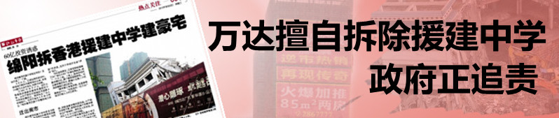 近日,一則內(nèi)容為 “香港政府撥款和教育界募捐所得重建的綿陽一所中學(xué),遭到地方當(dāng)局拆毀”的網(wǎng)帖引發(fā)了廣泛關(guān)注。在該校原址,記者看到校園被萬達(dá)廣場巨大的廣告墻包圍起來,成了一片大工地。工地上,原來學(xué)校的教學(xué)樓仍在,整個(gè)建筑搖搖欲墜。而在教學(xué)樓的背后,數(shù)幢正在施工中的高層樓盤已接近封頂……
