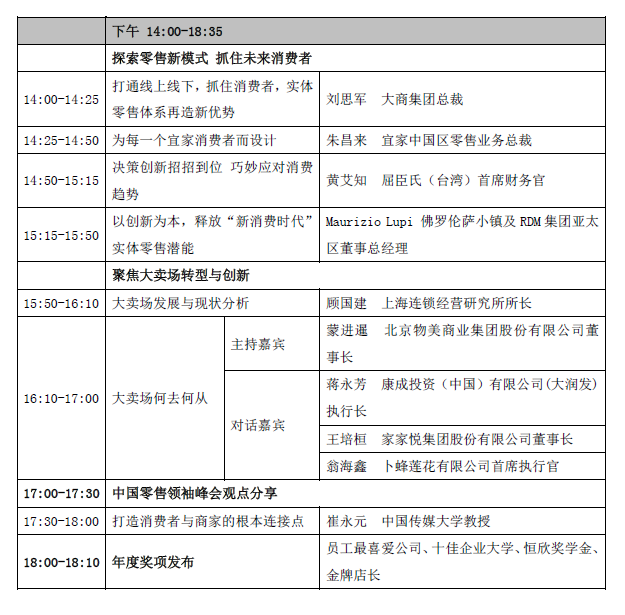本次會(huì)議共分為四個(gè)篇章:共建零售新生態(tài)、聚焦年度人物、探索零售新模式 抓住未來(lái)消費(fèi)者、聚焦大賣(mài)場(chǎng)轉(zhuǎn)型與創(chuàng)新。